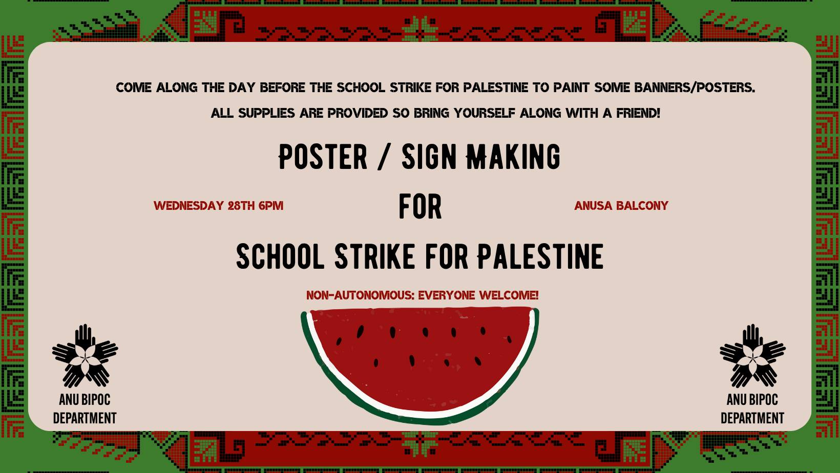 Come along on Wednesday, the day before the School Strike for Palestine on Thursday, to paint some banners/posters. All supplies are provided so bring yourself along with a friend!